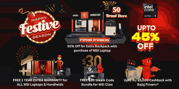 Celebrate this festive season with unbeatable deals on MSI laptops and handhelds. From 8th September to 23rd October 2025, enjoy up to 45% OFF on the latest gaming, business & student laptops powered by leading-edge Intel Core Ultra 9 processors. You will get 1 Year Extra Warranty on all MSI laptops, 50% OFF for Extra backpack with purchasing MSI Laptops, and a FREE $30 Steam Code with MSI Claw. Also, grab up to ₹10,000 cashback with Bajaj Finserv from 22nd September 2025- 2nd October and 15th October to 23rd October 2025. Whether you’re upgrading to a high-performance gaming laptop or a productivity-focused business laptop, or you are an amazing content creator these festive laptop offers give you maximum value and performance.